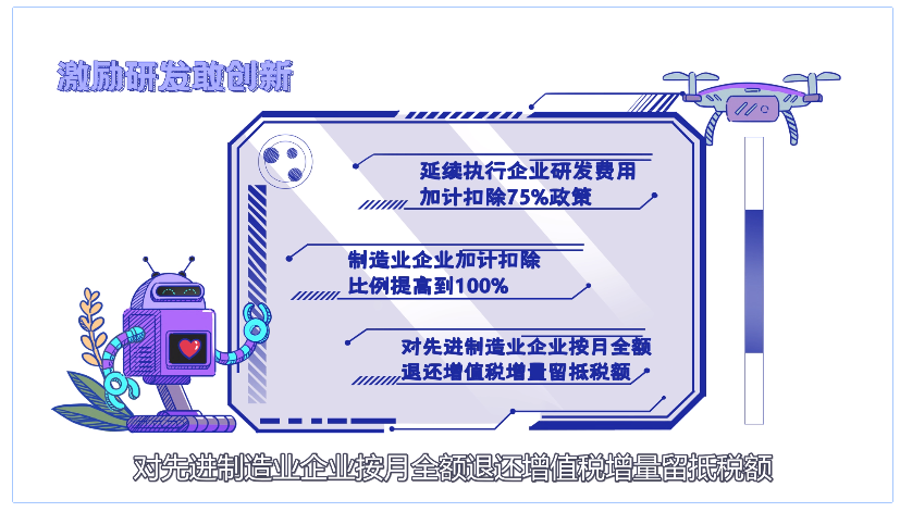今年還將激勵企業(yè)研發(fā)敢創(chuàng)新,除了延續(xù)執(zhí)行企業(yè)研發(fā)費用加計扣除75%的政策,將制造業(yè)企業(yè)加計扣除比例提高到100%,對先進制造業(yè)企業(yè)按月全額退還增值稅增量留抵稅額;